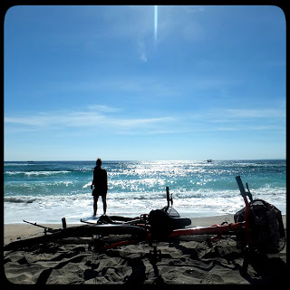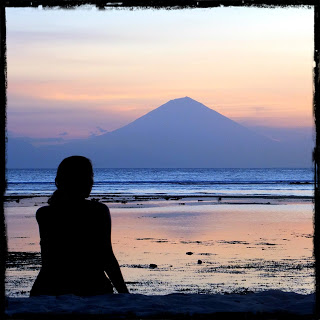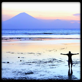 Encontramos hostel barato y bicis para recorrer toda la isla por senderos de arena, cosa que llevaba una media hora. Y ahora qué? Pues en eso estábamos, recorriéndola de arriba abajo buscando un rincón donde meditar algunas cosas de la vida. Como por ejemplo porqué hemos tardado tanto en salir a recorrer el mundo. Y sin darnos cuenta estábamos viendo un atardecer perfecto con la inmensa figura cónica del volcán Batur de Bali al fondo, tomando una fresca bintang (cerveza indonesia, no especialmente barata pero muy rica) y conversando con otros viajeros maravillados como nosotros con el atardecer.