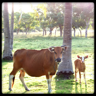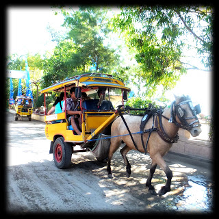 El fast boat se hizo eterno porque las corrientes son fortísimas en los mares de indonesia y se podía adivinar por las caras de algunos que lo de las birritas a bordo ya no era tan buena idea. Finalmente llegamos a la isla y cuando los participantes de Gili Shore se dispersaron con sus pamelas arrastrando sus maletones por la arena, un coche de caballos al trote nos peinó el flequillo bajo la mirada distraída de una vaca que rumiaba bajo una palmera. Mmm… Extraña fusión la de esta isla.