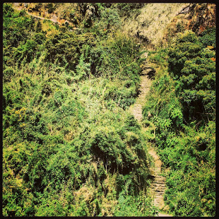 Entre escalones, raíces de arrayanes, orquideas y preciosos riachuelos, llegamos al primer descanso colectivo. Llevábamos un cuarto del camino y ya estábamos ko, contemplamos la preciosa vista que quedaba cada vez más abajo y continuamos. Ahora sí, cientos de escalones de medio metro cada uno llevaban hasta el paso de la mujer muerta (se llama así por la forma que adopta, no porque ninguna mujer la haya palmado allí al llegar, aunque tampoco sería de extrañar) eso significa que cada dos escalones estábamos un metro más arriba y eso implica que la falta de aire nos hacía cada vez más imposible seguir. Subíamos tres con fuerza y arranque, y descansabamos uno. Un ritmo frenético.