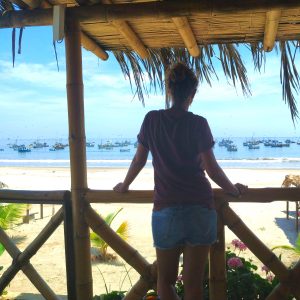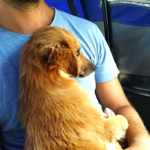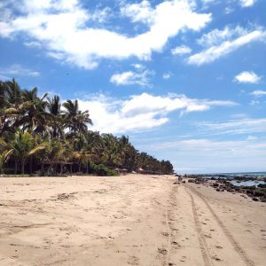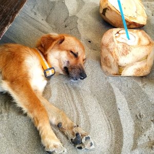 Tras muchos paseos por la playa, una noche se nos juntó sin permiso ni vergüenza una perrita diminuta, decidida desde el primer momento en que nos vió a adoptarnos y enseñarnos el pueblo entero. De día y de noche. 4 días nos esperó frente a la puerta del hostel, y cada mañana al despertar la veíamos a través de las cañas de bambú de la puerta esperarnos pacientemente, sin levantar más de un palmo del suelo, oteando cada vez que se abría la puerta y moviendo el rabito con una tremenda ilusión cada vez que nos veía. Y 4 días estuvimos intentando buscarle un hogar donde necesitaran imperiosamente todo el amor que esta pequeñaja tenía para dar. Al quinto día le pusimos nombre, la vacunamos, le compramos una cama y un pasaje de autobús. Ya somos 3 en este viaje sin rumbo.