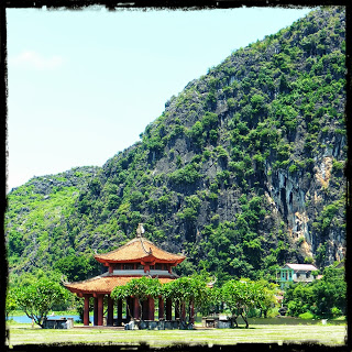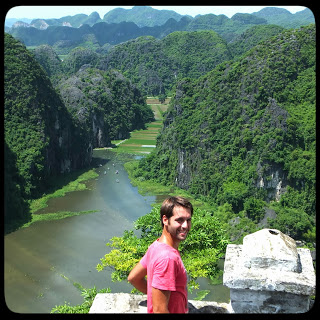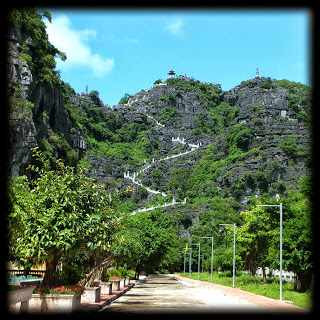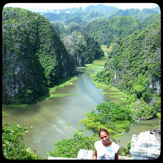El terreno es tan escarpado que hasta las cabras montesas utilizan las escaleras para avanzar, pero no lo pensamos dos veces y empezamos a subir escaleras con el paraguas abierto para cubrirnos del sol, muy bucólico y asiático el retrato. Vaya par de capullos debían pensar dos vietnamitas a la sombra de un sauce. Aunque sudando como pollitos, al llegar arriba nos dimos cuenta de cuánto valió la pena el esfuerzo, es la vista más hermosa que hemos presenciado en Vietnam, hasta donde llega la vista pequeñas montañas se cubren unas a otras perfectamente ordenadas para que el río discurra tranquilamente a sus pies, increíble!!