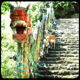Lo mejor de todo es que el mismo paisaje que acabábamos de recorrer en barca, pudimos verlo desde otra perspectiva que nos dio la noción exacta de la belleza del lugar. De Tam Coc fuimos hacia la Mua Cave, aunque encontrarla nos llevó varios intentos e idas y venidas con la moto porque está francamente escondida. De hecho la encontramos gracias a los amigos viajeros de Un cambio de aires, y cuando al fin llegamos a lo que parecía la entrada, vimos por fin una resplandeciente serpiente blanca subir la montaña. Mil escaleras, a las once del mediodía y ni una nube en el cielo… Pero no era una cueva?